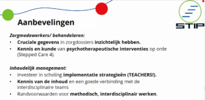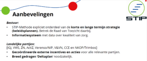 Het startpunt van het merendeel van de workshop-deelnemers, is vergelijkbaar met dat van de onderzochte instellingen: een van relatieve, maar (deels) bewuste onkunde. Urgentiebesef vergroot de kans op implementatie, maar is slechts de eerste stap van velen. Eén van onze voornaamste aanbevelingen is dan ook dat de methodische aanpak van probleemgedrag een expliciet onderdeel moet zijn bij alle lagen in de organisatie. Met name ook van de korte- en langetermijnstrategie van het bestuur, inclusief de bijbehorende scholing, financiën en betrekking van de Raad van Toezicht. De belangrijkste aanbevelingen op basis van het onderzoek zijn hieronder weergegeven.